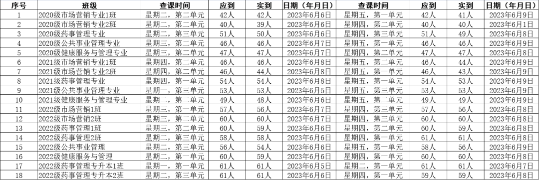为全面推进本科教育水平评估工作,健康beat365中文官方网站党委积极组织学生党员开展查课工作,于6月11日,对第十四周的查课情况做出总结。本周查课以严谨认真的态度对迟到、旷课、带早餐的学生进行了督促和教育。学生党员进入每间教室内检查学生出勤情况。经过一周的督查,学院共查18个班级36节课,覆盖学院全体20级、21级、22级及22级专升本共952名学生。现查课通报如下: