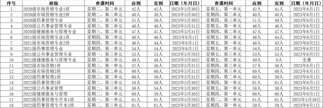 为全面推进本科教育水平评估工作,健康beat365中文官方网站党委积极组织学生党员开展查课工作,于6月3日,对第十三周的查课情况做出总结。本周查课以严谨认真的态度对迟到、旷课、带早餐的学生进行了督促和教育。学生党员进入每间教室内检查学生出勤情况。经过一周的督查,学院共查18个班级36节课,覆盖学院全体20级、21级、22级及22级专升本共952名学生。现查课通报如下: