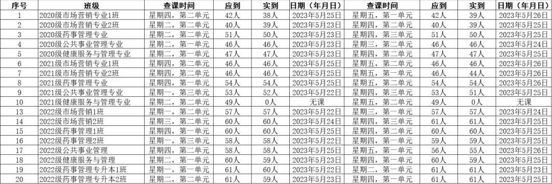 为全面推进本科教育水平评估工作,健康beat365中文官方网站党委积极组织学生党员开展查课工作,于5月27日,对第十二周的查课情况做出总结。本周查课以严谨认真的态度对迟到、旷课、带早餐的学生进行了督促和教育。学生党员进入每间教室内检查学生出勤情况。经过一周的督查,学院共查18个班级36节课,覆盖学院全体20级、21级、22级及22级专升本共952名学生。现查课通报如下: