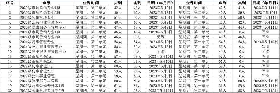 为全面推进本科教育水平评估工作,健康beat365中文官方网站党委积极组织学生党员开展查课工作,于5月14日,对第十周的查课情况做出总结。本周查课以严谨认真的态度对迟到、旷课、带早餐的学生进行了督促和教育。学生党员进入每间教室内检查学生出勤情况。经过一周的督查,学院共查18个班级36节课,覆盖学院全体20级、21级、22级及22级专升本共952名学生。现查课通报如下: