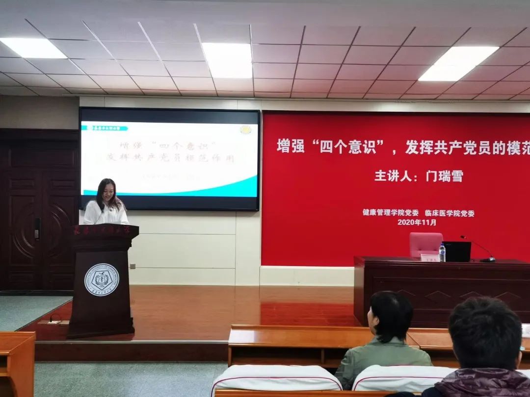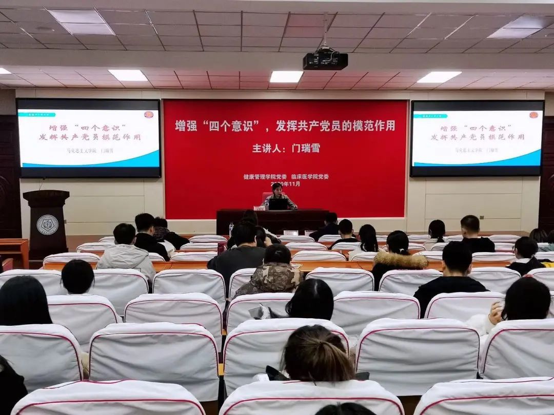 2020年11月16日,健康beat365中文官方网站、临床医学院党校学生入党积极分子培训班在致知楼莲心报告厅举行,邀请到马克思学院院长门瑞雪教授作题为《增强“四个意识”,发挥共产党员的模范作用》的专题党课。