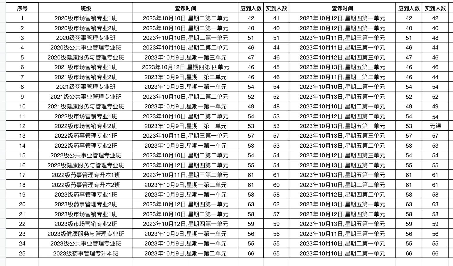 为全面推进本科教育水平评估工作,健康beat365中文官方网站党委积极组织学生党员开展查课工作,于10月15日,对第七周的查课情况做出总结。本周查课以严谨认真的态度对迟到、旷课、带早餐的学生进行了督促和教育。学生党员进入每间教室内检查学生出勤情况。经过一周的督查,学院共查25个班级50节课,覆盖学院全体20级、21级、22级、23级、22级专升本以及23级专升本共1447名学生。现查课通报如下: