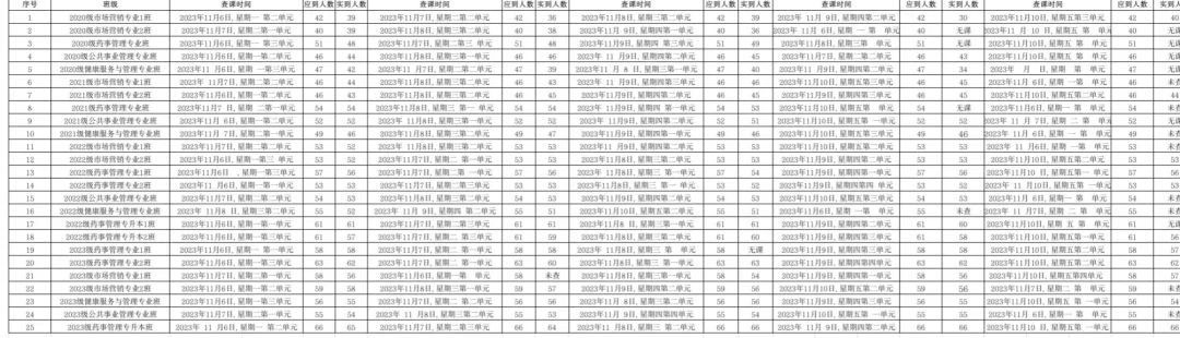 为全面推进本科教育水平评估工作,健康beat365中文官方网站党委积极组织学生党员开展查课工作,于11月12日,对第十一周的查课情况做出总结。本周查课以严谨认真的态度对迟到、旷课、带早餐的学生进行了督促和教育。学生党员进入每间教室内检查学生出勤情况。经过一周的督查,学院共查25个班级125节课,覆盖学院全体20级、21级、22级、23级、22级专升本以及23级专升本共1335名学生。现查课通报如下: