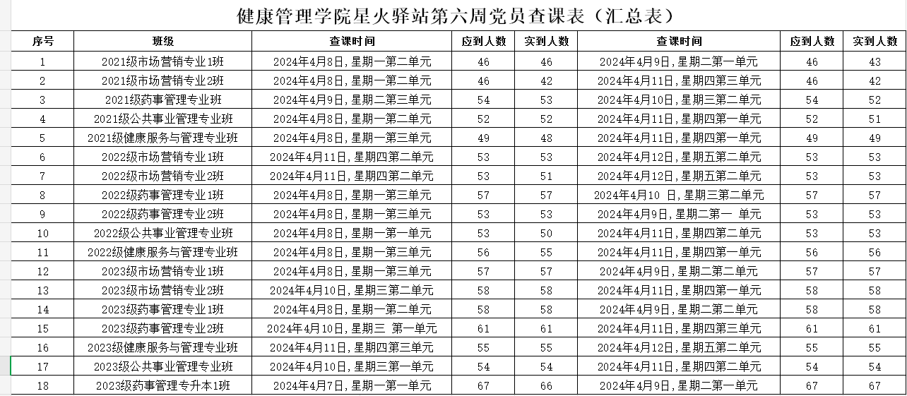 为加强学院学风建设,规范课堂秩序,营造良好的学习氛围,健康beat365中文官方网站党委积极组织学生党员开展查课工作,于4月14日,对第六周的查课情况做出总结。本周查课以严谨认真的态度对迟到、旷课、带早餐的学生进行了督促和提醒。学生党员进入每间教室内检查学生出勤情况。经过一周的督查,学院共查18个班级36节课,覆盖学院全体21级、22级、23级以及23级专升本共982名学生。现查课通报如下: