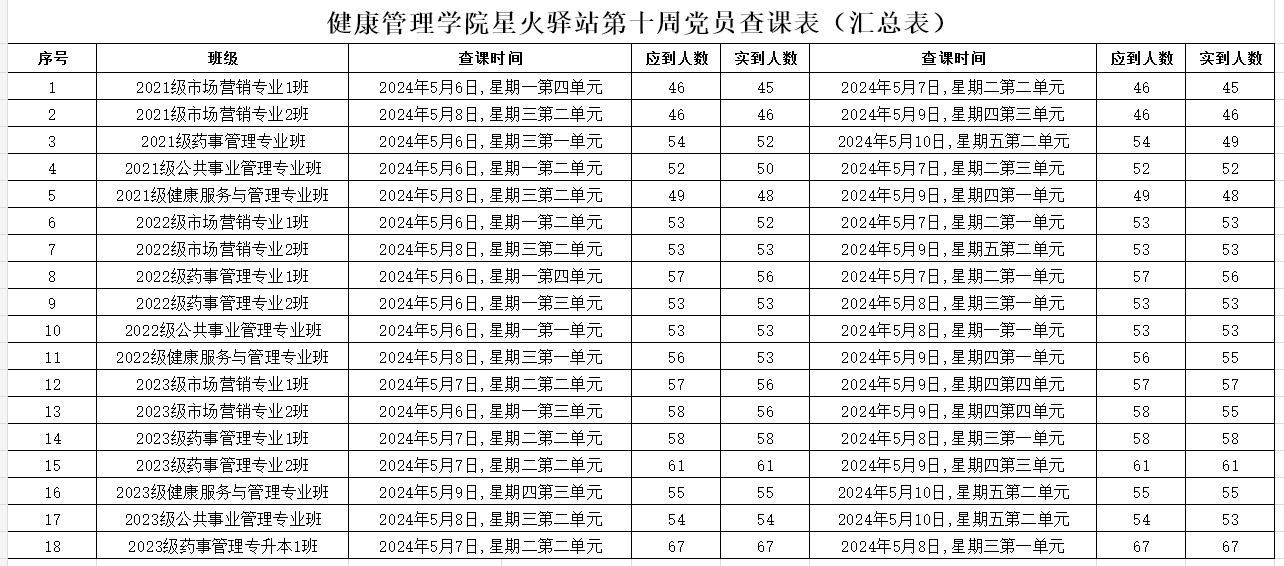 为加强学院学风建设,规范课堂秩序,营造良好的学习氛围,健康beat365中文官方网站党委积极组织学生党员开展查课工作,于5月12日,对第十周的查课情况做出总结。本周查课以严谨认真的态度对迟到、旷课、带早餐的学生进行了督促和提醒。学生党员进入每间教室内检查学生出勤情况。经过一周的督查,学院共查18个班级36节课,覆盖学院全体21级、22级、23级以及23级专升本共982名学生。现查课通报如下: