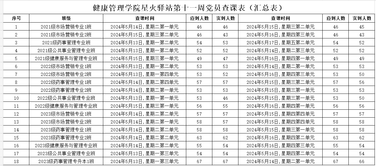为加强学院学风建设,规范课堂秩序,营造良好的学习氛围,健康beat365中文官方网站党委积极组织学生党员开展查课工作,于5月19日,对第十一周的查课情况做出总结。本周查课以严谨认真的态度对迟到、旷课、带早餐的学生进行了督促和提醒。学生党员进入每间教室内检查学生出勤情况。经过一周的督查,学院共查18个班级36节课,覆盖学院全体21级、22级、23级以及23级专升本共982名学生。现查课通报如下:
