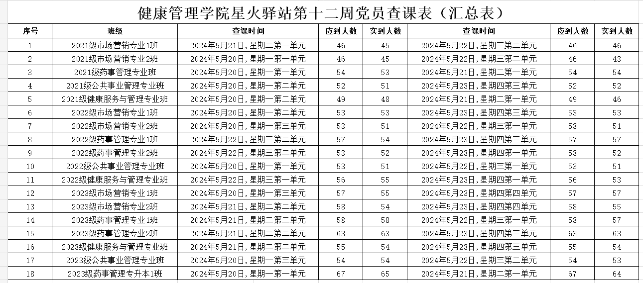 为加强学院学风建设,规范课堂秩序,营造良好的学习氛围,健康beat365中文官方网站党委积极组织学生党员开展查课工作,于5月26日,对第十二周的查课情况做出总结。本周查课以严谨认真的态度对迟到、旷课、带早餐的学生进行了督促和提醒。学生党员进入每间教室内检查学生出勤情况。经过一周的督查,学院共查18个班级36节课,覆盖学院全体21级、22级、23级以及23级专升本共982名学生。现查课通报如下: