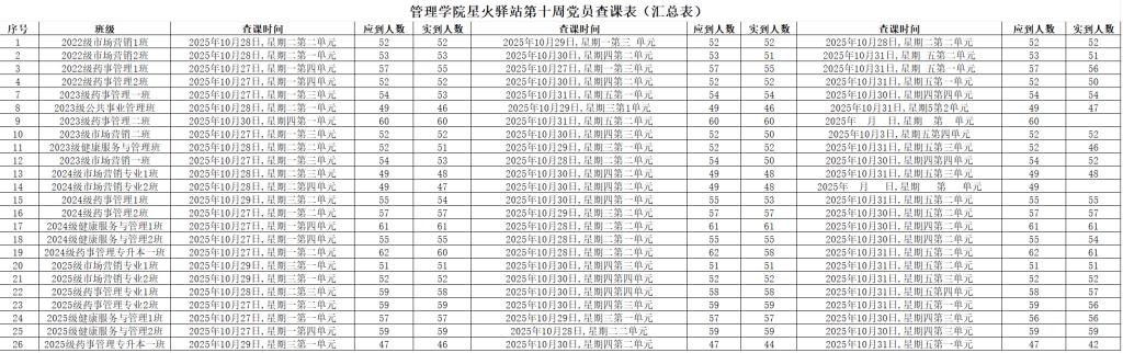 为加强学院学风建设,规范课堂秩序,营造良好的学习氛围,beat365中文官方网站党委积极组织学生党员开展查课工作,于10月31日,对第十周的查课情况做出总结。本周查课以严谨认真的态度对迟到、旷课、带早餐的学生进行了督促和提醒。学生党员进入每间教室内检查学生出勤情况。经过一周的督查,学院共查26个班级79节课,覆盖学院全体22级、23级、24级、25级以及24级和25级专升本共1307名学生。现查课通报如下: