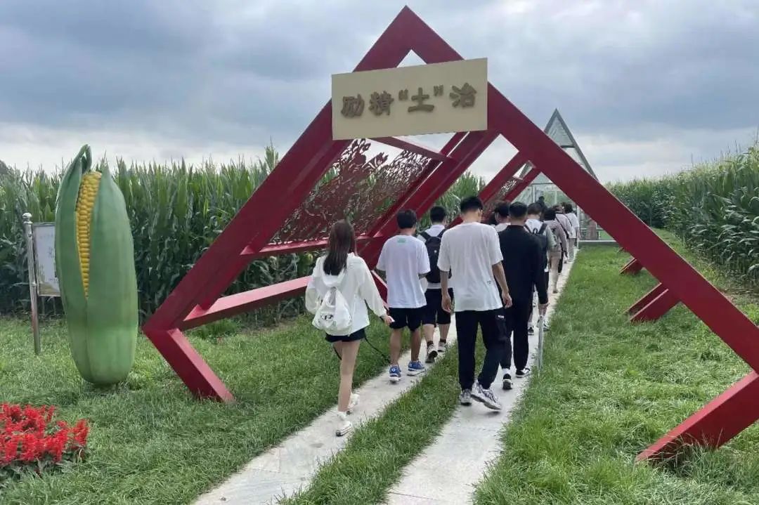 随后,团队前往梨树县全国百万亩玉米绿色原料基地,齐整的玉米苗亭亭玉立,颗粒饱满。极目远眺,湛蓝的天空下,大地无垠,翠海无边。通过讲解员的现场教学,同学们参观学习梨树模式,进一步了解学习到保障粮食安全的重要性。