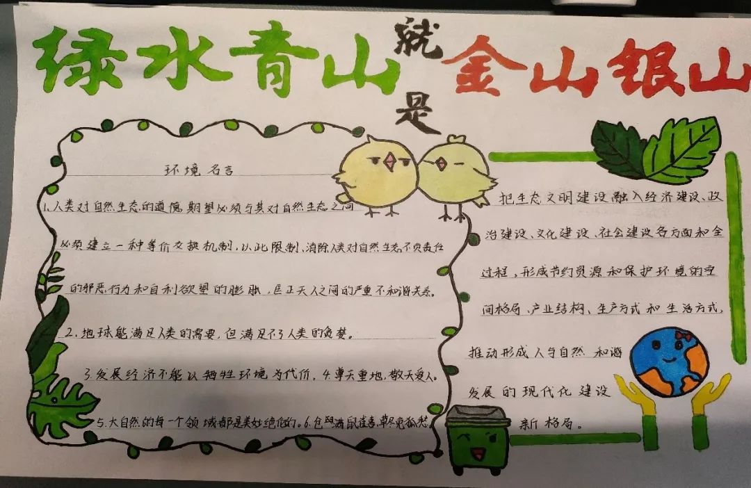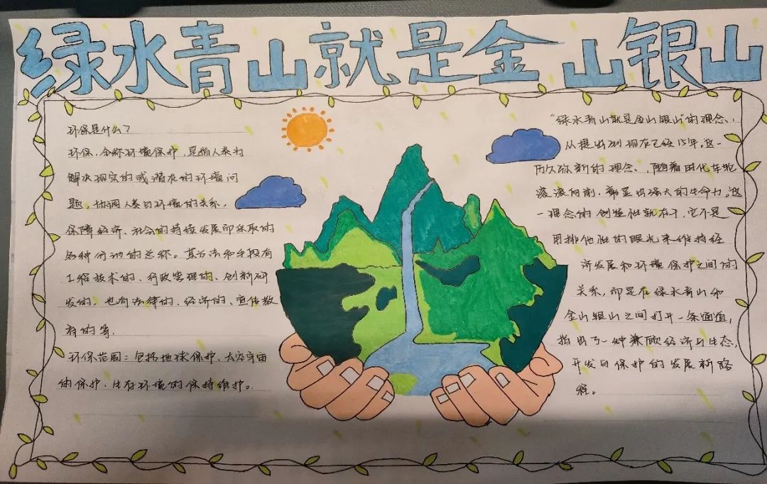 “绿水青山就是金山银山”阐述了经济发展和生态环境保护的关系。这一理念强调保护生态环境就是保护生产力、改善生态环境就是发展生产力,指明了实现发展和保护协同共生的新路径。为此,健康beat365中文官方网站开展“绿水青山就是金山银山”主题手抄报活动。