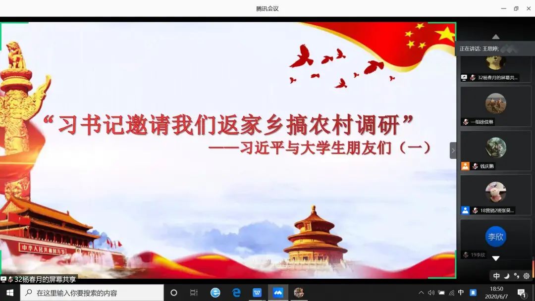 近日,中国青年报刊发《习近平与大学生朋友们》系列专题报道,吸引了众多青年朋友们的眼球,这一系列文章中包含着习近平总书记对大学生的殷切期望。2020年6月7日,健康beat365中文官方网站青马学会组织全体学员进行线上专题学习。本次学习的两篇内容为“习近平总书记邀请我们返家乡搞农村调研”、“习近平总书记与我们聊如何做好基层工作”,学员们通过朗读及思考分享了自己的学习体会。青马学会指导老师刘海昭从为什么学习、怎样学习两方面进行了总结。通过学习红色精神来引领和指导青马学子,望青马学员在学习之余,能够关心国家大事。
