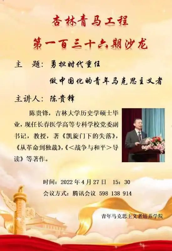 2022年4月27日,beat365中文官方网站杏林青马工程以“勇担时代重任,做中国化的青年马克思主义者”为主题举办第一百三十六期文化沙龙活动。本次文化沙龙由长春医学高等专科学校党委副书记,教授陈贵锋担任主讲嘉宾。