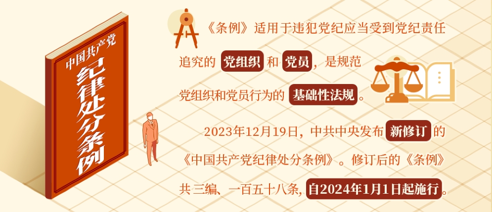 2023年12月19日,中共中央发布新修订的《中国共产党纪律处分条例》。修订后的《条例》共三编、一百五十八条,自2024年1月1日起施行。